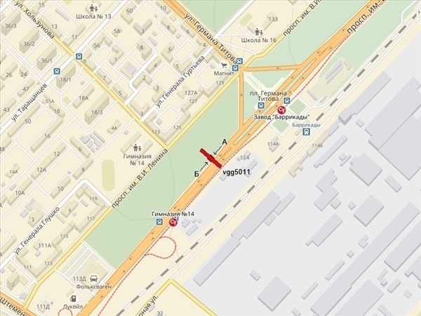 В.И.Ленина пр-т, при движении в центр, справа, в 110м за пересечением с ул. им.Титова, в 500м до ост. "Стадион Монолит", в 350м до автоцентра "ВАЗ"