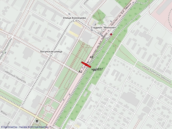 Ленина пр-т, разделительная полоса, сторона А1 - слева при движении в центр, 40м до поворота на ул. Богунская, сторона А2 - слева при движении из центра, 200м до поворота на ул.Генерала Штеменко