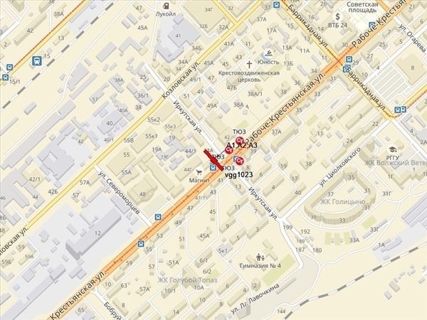 Рабоче-Крестьянская ул., д.44, при движении из центра, справа, за пересечением с ул.Иркутская (брандмауэр)
