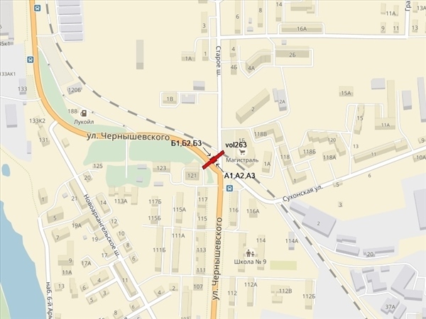 Чернышевского ул., у ТЦ "Магистраль", в районе пересечения со Старым шоссе, справа при движении из города (Архангельское направление)
