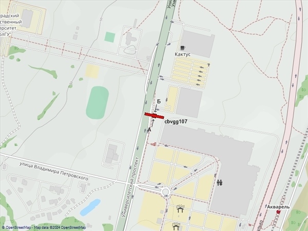 Университетский пр-т, 105А, поворот к гипермаркету "Спормастер Pro", справа при движении в центр, 300м до гипермаркета "Лента" (сторона Б - при движении к ТРЦ "Акварель", гипермаркетам "Лемана Про", "Ашан")