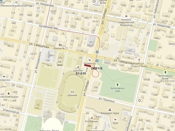 Победы ул., 38/27, ТЦ "Бутусовский", 60м до пересечения с ул.Свердлова, в районе стадиона "Шинник", 150м от ТРЦ"АУРА", слева при движении от ул.Свободы