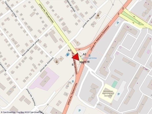 Менделеева ул., выезд на ул.Лермонтова, разделительный остров, сторона А1 - при движении от 3-й Продольной магистрали, А2 - справа при движении от ул.Еременко в центр, Б - слева при движении по ул.Лермонтова из центра