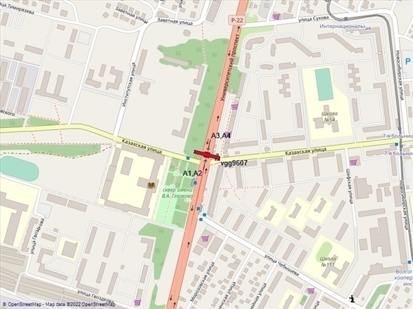 Университетский пр-т, 23, пересечение с ул.Казахской, разделительный остров, стороны А1,А2 - слева при движении в центр, А3,А4 - слева при движении из центра