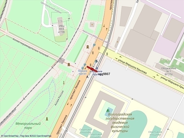 Ленина пр-т, напротив входа в ИМК"Мамаев курган", справа при движении из центр